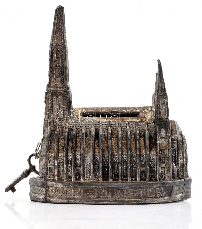 Leírás: Ulmi székesegyház fém persely kulccsal, sérült, kopott állapotban, 10,5x9x4 cm
