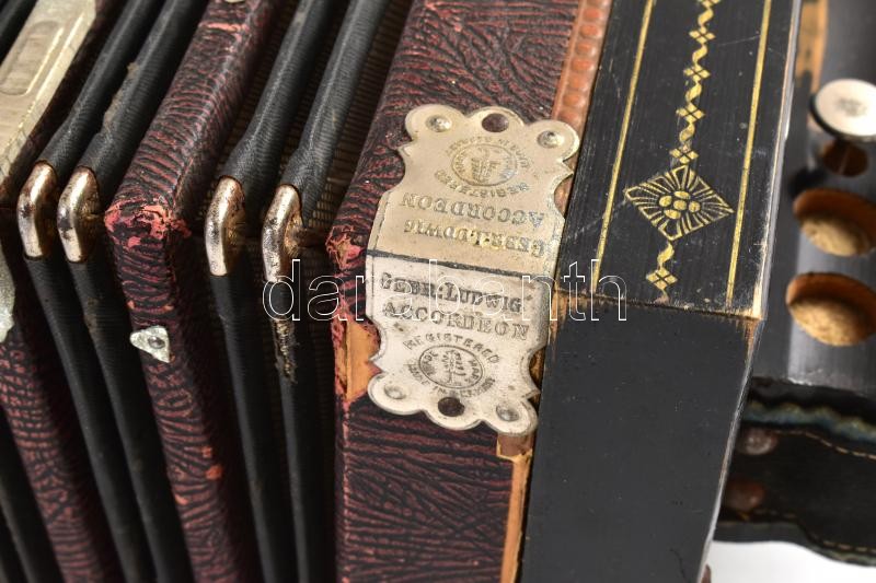 Leírás: Gebrüder Ludwig - Reményi Mihály akkordeon, tangóharmonika. XX. sz. eleje. Jelzett, működőképes, díszek, kapcsok kissé hiányosak. Összecsukva 29x26 cm