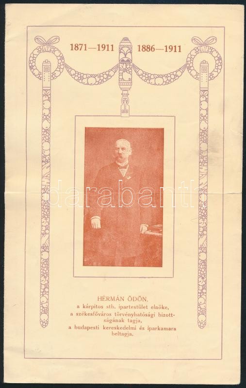 1911 Hermann Ödön kárpitos stb ipartestület elnökének 40 lves jubileum... https://www.darabanth.com/hu/395-Gyorsarveres/395.0/Mutargy-papirregiseg-egyeb/Nyomtatvanyok~500031/1911-Hermann-Odon-karpitos-stb-ipartestulet-elnokenek-40-lves-jubileumara-kiadott-emleklap-1~II2397776