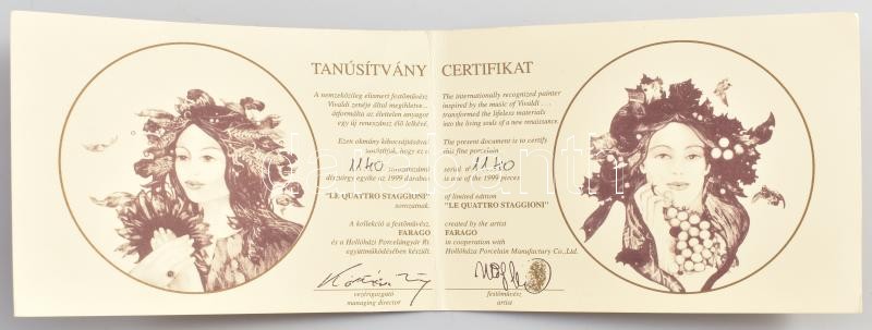 Hollóházi porcelán váza Faragó Miklós (1947- ) által tervezett A négy évszak - Tavasz dekorral. Limitált szériás, kézzel sorszámozott, 1140/1999 sorszámmal. Levonóképes, aranyozott, jelzett, tanúsítvánnyal, minimális kopással. m: 35 cm