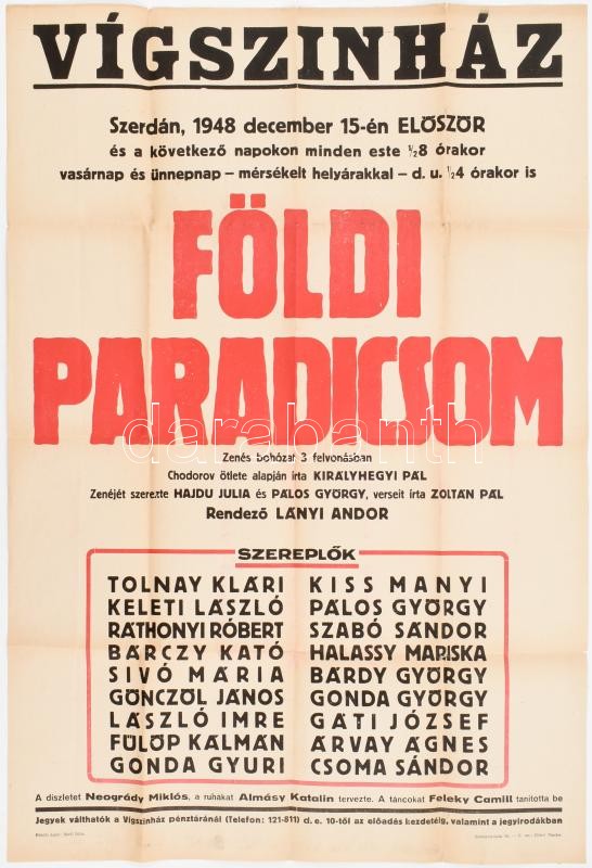 1948 Vígszínház Földi Paradicsom c. előadásának nagyméretű plakátja, s... https://www.darabanth.com/hu/395-Gyorsarveres/395.0/Mutargy-papirregiseg-egyeb/Plakat~2000020/1948-Vigszinhaz-Foldi-Paradicsom-c-eloadasanak-nagymeretu-plakatja-szereplok-Tolnay-Kl~II2400469