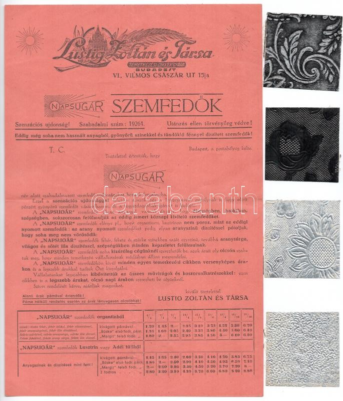 1934 Lustig Zoltán és Társa Bp., Napsugár szemfedők reklám szórólap és... https://www.darabanth.com/hu/395-Gyorsarveres/395.0/Mutargy-papirregiseg-egyeb/Reklam~500022/1934-Lustig-Zoltan-es-Tarsa-Bp-Napsugar-szemfedok-reklam-szorolap-es-arajanlat-mintadar~II2396609
