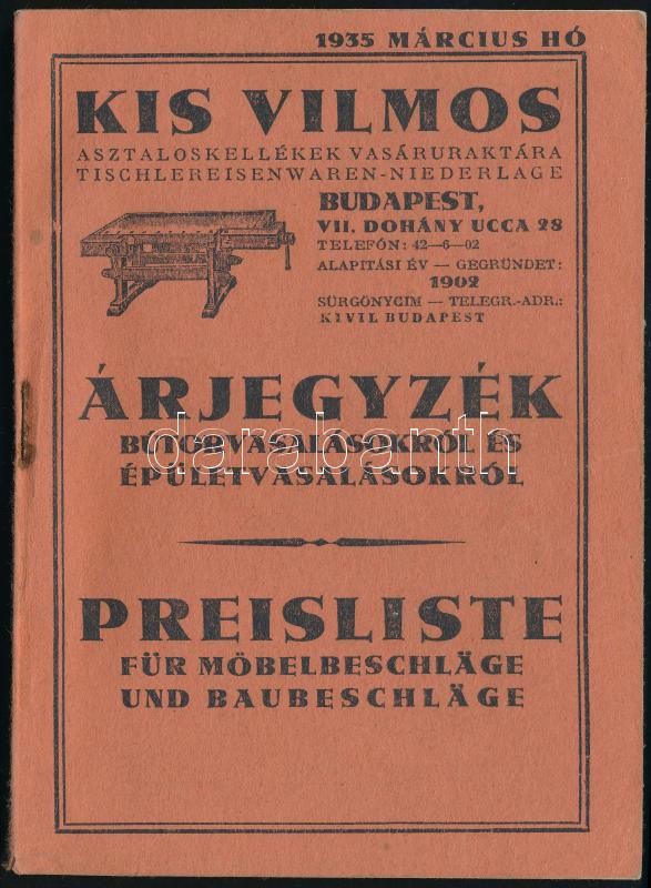 1935 Kis Vilmos asztaloskellékek vasáruraktára árjegyzék bútorvasalatokról és épületvasalatokról, Bp., Dohány-u.. 96p. SzÃnes és fekete-fehér képekkel gazdagon illusztrált. Kiadói tűzött papÃrkötés.