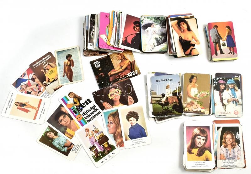 Leírás: cca 1970-87 kb. 370 hölgyes kártyanaptár, közte 43 db erotikus, 10 db totó-lottó, 28 db színésznő, többi reklám, nagyon kevés firkált