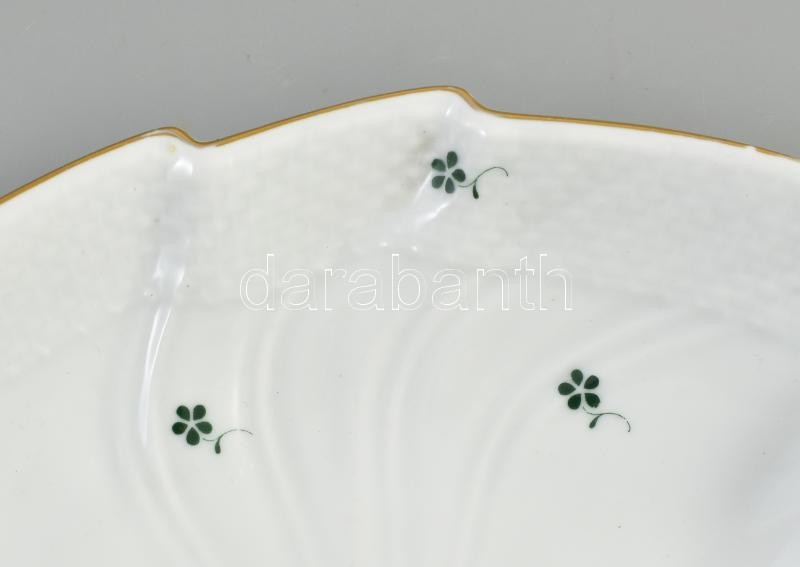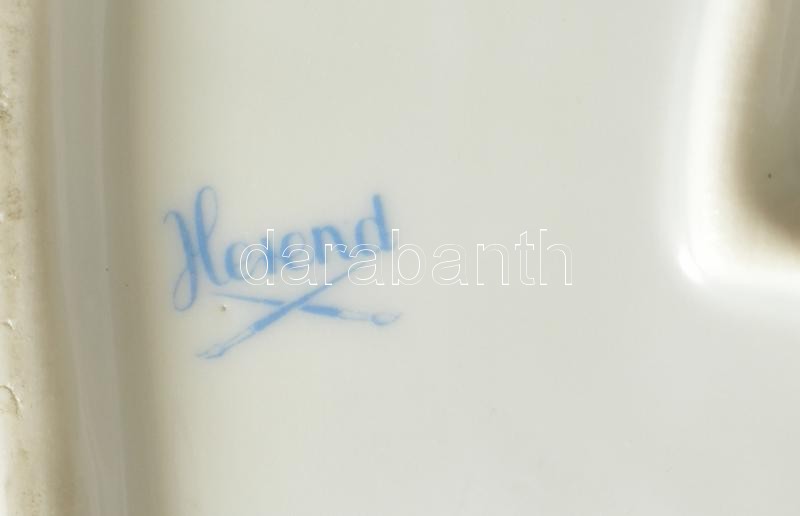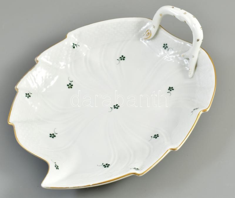 Leírás: Herendi fekete virág mintás levél formájú tálka. Kézzel festett, jelzett, kopott aranyozással 24x20 cm