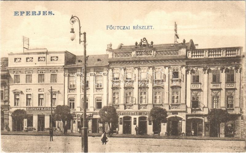 1906 Eperjes, Presov; Fő utca, gyógyszertár, Elefánt kávéház. Divald ... https://www.darabanth.com/hu/396-Gyorsarveres/396.0/Kepeslapok/Felvidek~1500006/1906-Eperjes-Presov-Fo-utca-gyogyszertar-Elefant-kavehaz-Divald-main-street-pharmacy~II2408961