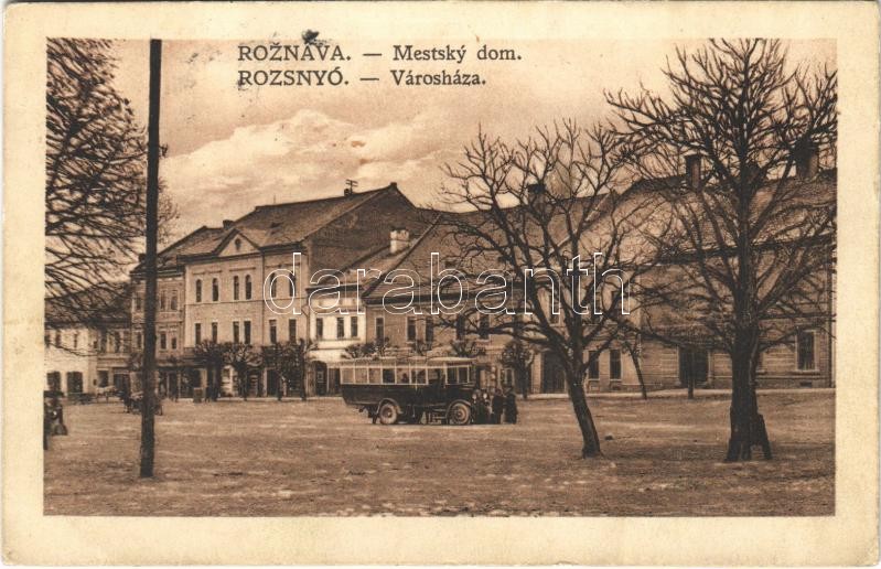 1928 Rozsnyó, Roznava; Városház, autóbusz / Mestsky dom / town hall, a... https://www.darabanth.com/hu/396-Gyorsarveres/396.0/Kepeslapok/Felvidek~1500006/1928-Rozsnyo-Roznava-Varoshaz-autobusz-Mestsky-dom-town-hall-autobus~II2410561