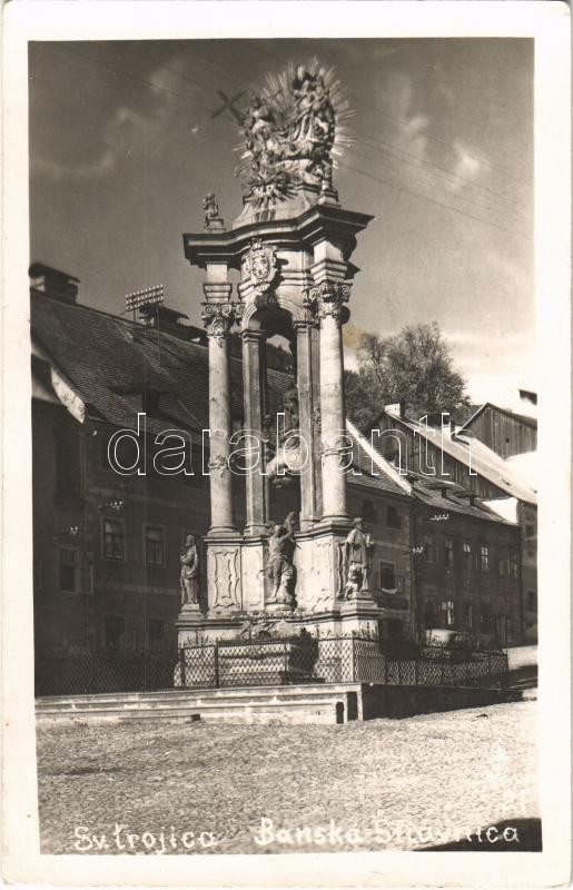 1933 Selmecbánya, Schemnitz, Banská Stiavnica; Szentháromság szobor, F... https://www.darabanth.com/hu/396-Gyorsarveres/396.0/Kepeslapok/Felvidek~1500006/1933-Selmecbanya-Schemnitz-Banska-Stiavnica-Szentharomsag-szobor-Franz-Barok-uzlete-Sv-T~II2409120