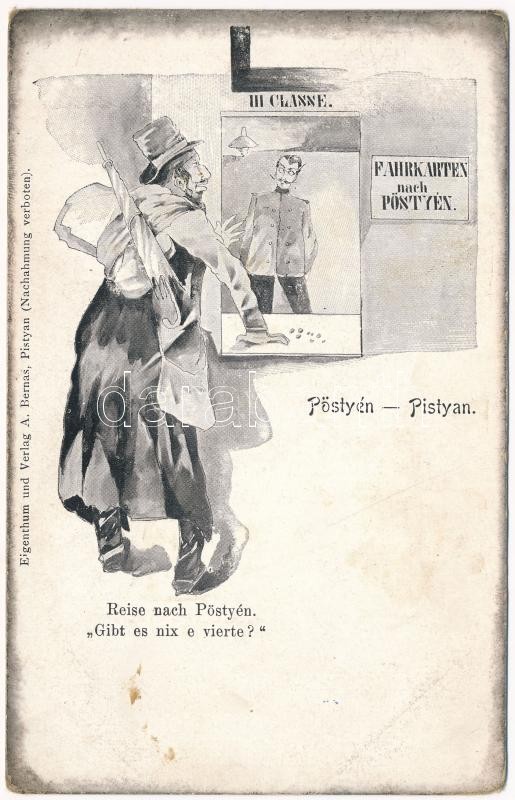 Pöstyén, Pistyan, Piestany; Nincs negyedosztály? Zsidó férfi harmadosztályra vesz jegyet. Humoros antiszemita judaika művészlap / III Classe Fahrkarten, Reise. Eigenthum und Verlag A. Bernas / Judaica anti-Semitic humour, Jewish man travelling on 3rd class