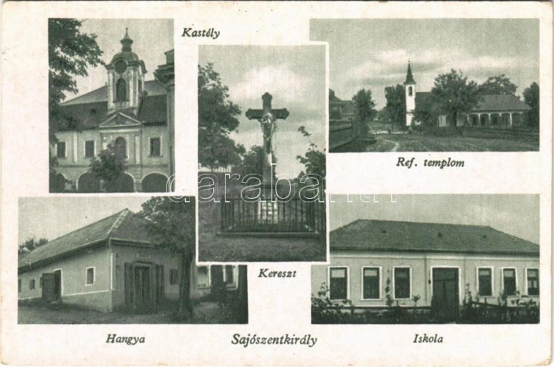 Leírás: Sajószentkirály, Král; Jankovich kastély, kereszt, Református templom, iskola, Hangya szövetkezet üzlete és saját kiadása / castle, cross, Calvinist church, school, cooperative shop