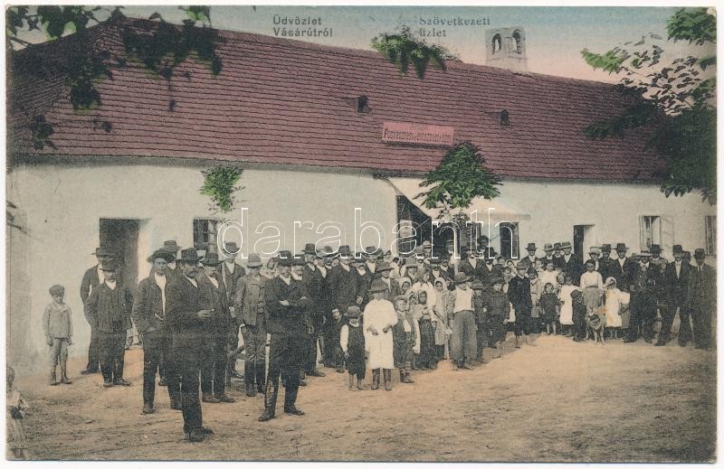 Leírás: Vásárút, Trhová Hradská; Fogyasztási és értékesítő szövetkezet üzlete és saját kiadása, falubeliek / cooperative shop, villagers