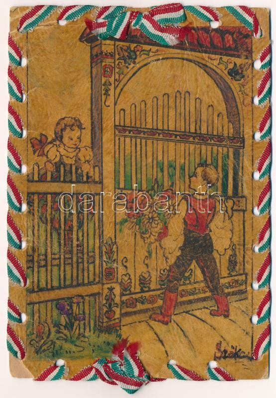 1943 Tábori Postai Levelezőlap. Magyarország jövő békessége és felvirágzása a szovjetoroszországi harcmezőkön dől el. Magyar szalaggal díszítve / WWII Hungarian military art postcard, irredenta. Decorated with Hungarian ribbon s: Szőke (EK)