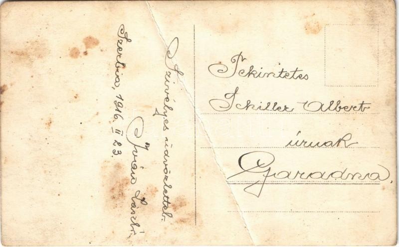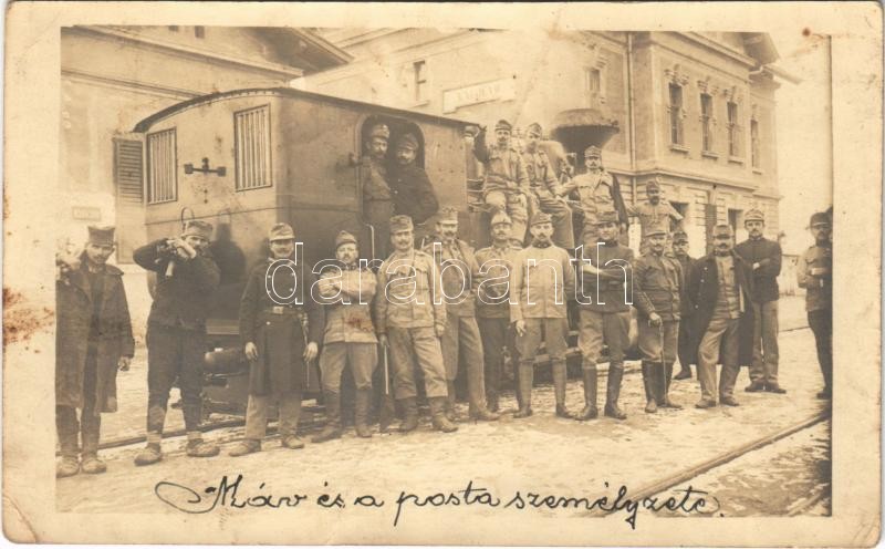 1916 Valjevo, MÁV és Posta személyzete a vasútállomáson, gőzmozdony / railway station, locomotive, staff of the Hungarian State Railways and Post. photo (fa)