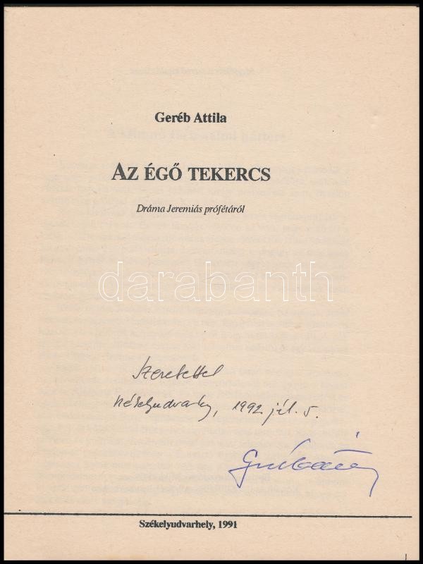 Geréb Attila: Az égő tekercs. Dráma Jeremiás prófétáról. A szerző által DEDIKÁLT példány. Székelyudvarhely, 1991, Szerzői kiadás, 55+1 p. Kiadói papírkötés.