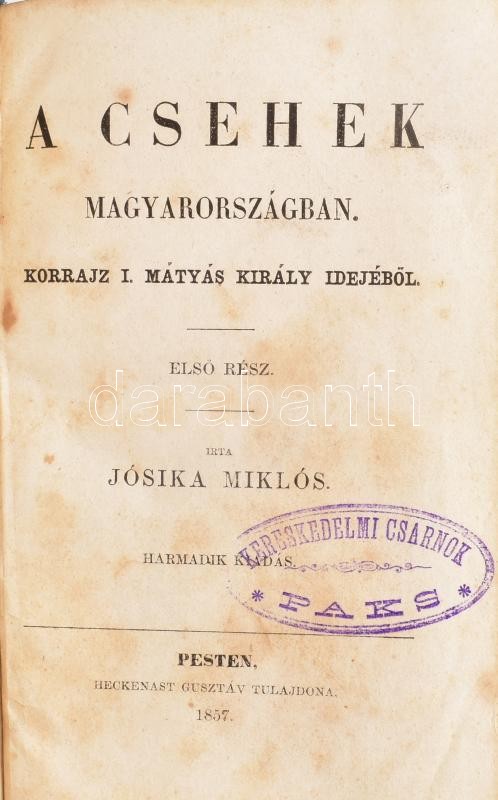 Jósika Miklós: A csehek Magyarországon. I-II. rész. Korrajz I. Mátyás király idejében. Pest, 1857, Heckenast Gusztáv, 196+204+155 p. Harmadik kiadás. Átkötött egészvászon-kötés, kopott borítóval, foltos lapokkal. b