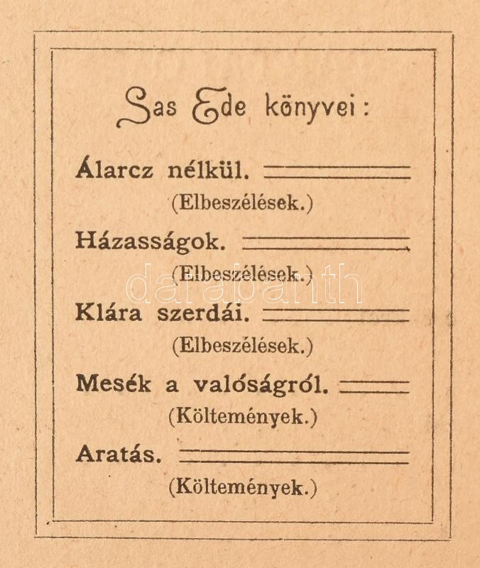 Sas Ede: Mai hősök. Bp.,[1902],Singer és Wolfner,(Nagyvárad, If. Berger Sámuel-ny.), 166+2 p. Első kiadás. Első kiadás. Kiadói szecessziós egészvászon-kötésben, (nagyváradi Lévai Márton-kötés, kopott, foltos borítóval, kissé sérült gerinccel. A szerző, Sas Ede (1869-1928) által Vinkler József (nyomtatott sajtóban Winkler, (1821-1907?)) nagyváradi választott püspök, nagyprépost, Nagyvárad díszpolgára részére dedikált példány.