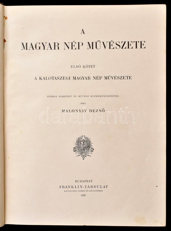 Malonyay Dezső: A magyar nép művészete. I. kötet. A kalotaszegi magyar nép művészete. Bp., 1907, Franklin-Társulat. 286 p. Kiadói aranyozott egészvászon-kötés, kissé kopott borítóval, helyenként kissé foltos lapokkal.