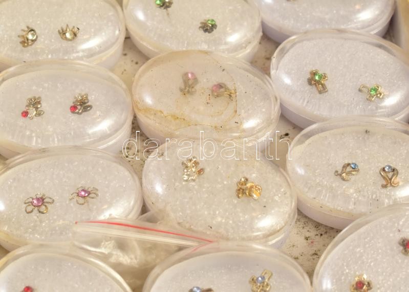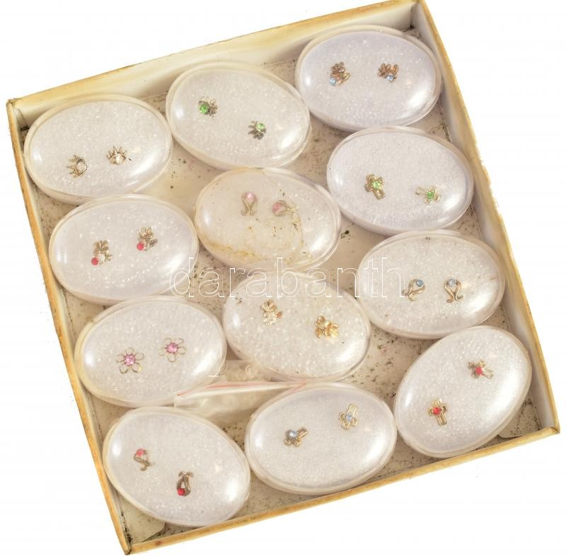 Leírás: 12 pár kis fülbevaló színes kövekkel, műanyag dobozokban