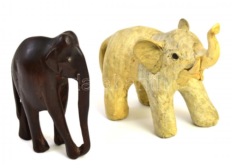 Leírás: 2 db elefánt: Fa, agyar nélkül, m: 14 cm + Gyurma vagy műanyag, m: 12 cm