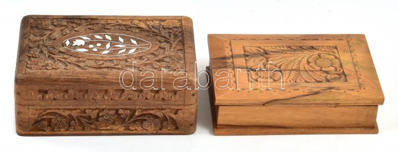 Leírás: 2 db faragott fa virágmintás ékszertartó doboz, kopással, karcolásokkal, 14x10x3,5 cm és 14,5x10x6 cm
