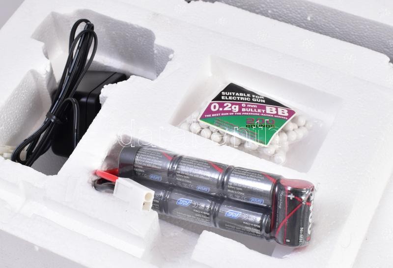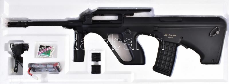 ASG Steyr Mannlicher AUG A2 6 mm airsoft puska, tartozékaival, új akkumulátorral, töltővel, leírással, 200 db lőszerrel, tanúsítvánnyal, újszerű állapotban, eredeti dobozában. 80x23 cm
