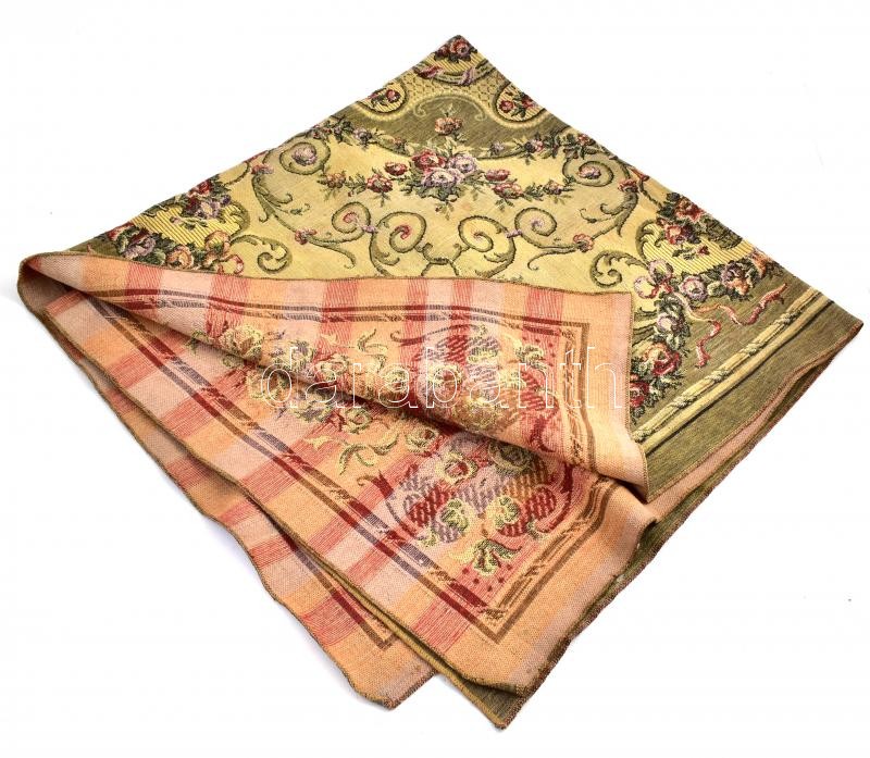 Leírás: Dekoratív virágmintás szőttes asztalterítő, kissé foltos, 132x131 cm