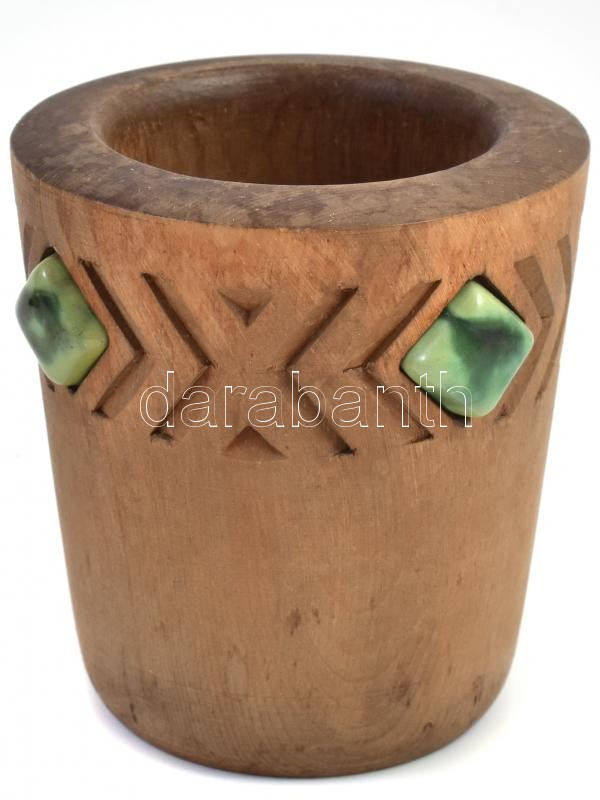 Leírás: Faragott fa kaspó zöld kövekkel, kis kopással, d: 8,5 cm, m: 9,5 cm