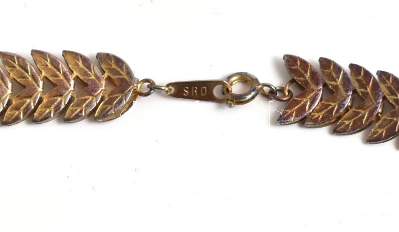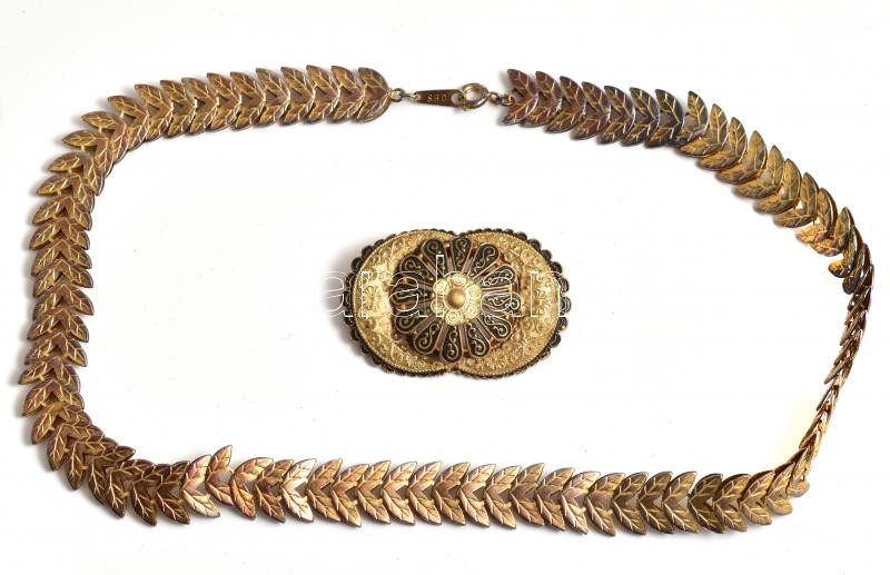 Leírás: Leveles, aranyszínű bizsu lánc, kicsit kopott, h: 40 cm + virágmintás bross aranyszínű díszítéssel, jó állapotban, 4x3 cm