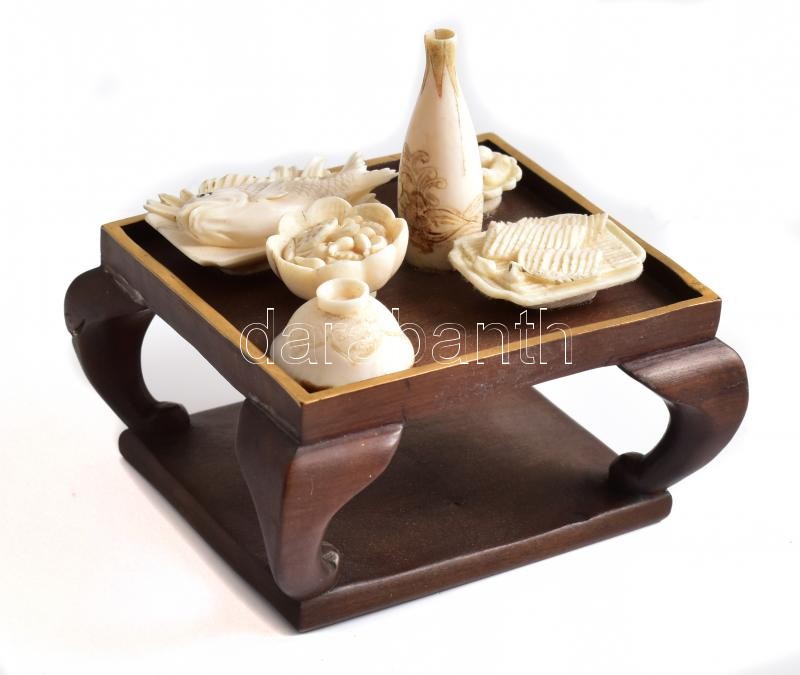 Leírás: Mini fa asztal, tetején csontból készített, ráragasztott tárgyakkal (hal, palack, stb.), apró kopásnyomokkal, m: 8,5 cm