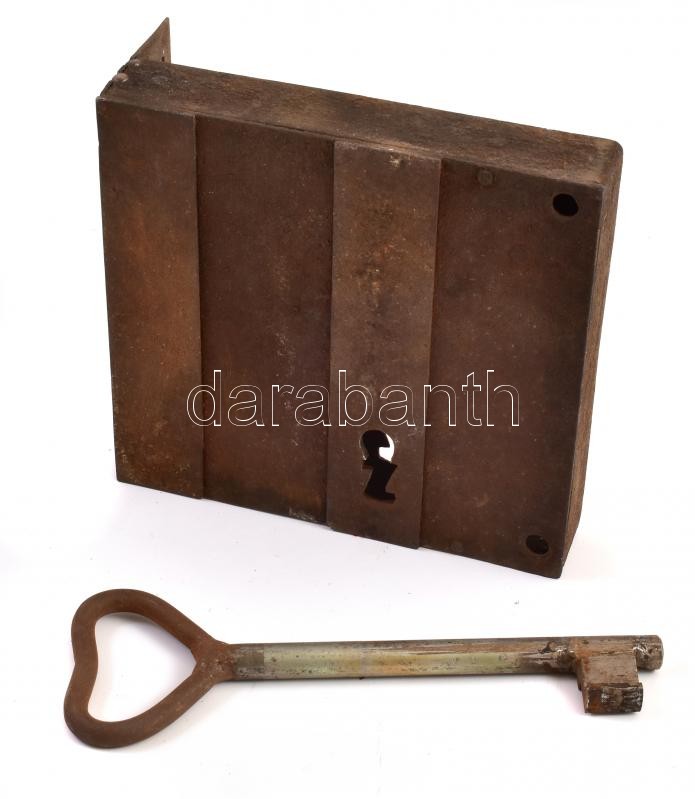 Leírás: Régi pincezár, kulccsal, rozsdás, 16×18 cm