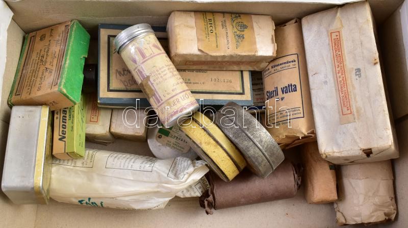 Leírás: cca 1930-40 kötszerek, gyógyszeres dobozok cipősdobozban