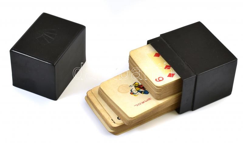 Leírás: 2 pakli használt francia kártya, bakelit tartóban, egyik Joker foltos