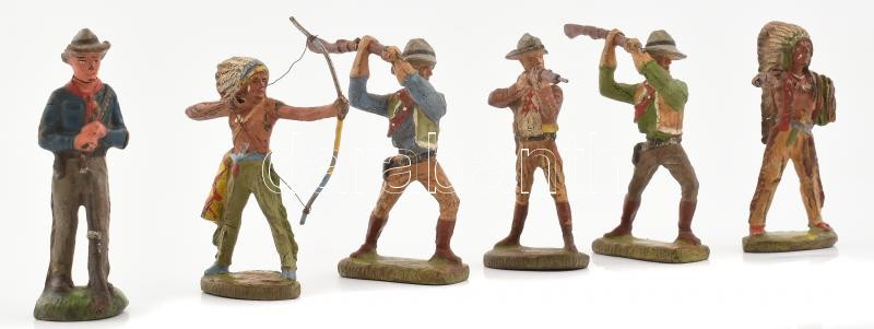 Leírás: cca 1910-1930 Elastolin indián és cowboy játékfigurák, 6db, kézzel festettek, kopásokkal, sérülésekkel, m: 8 cm