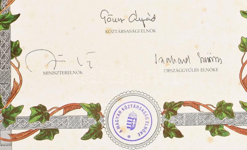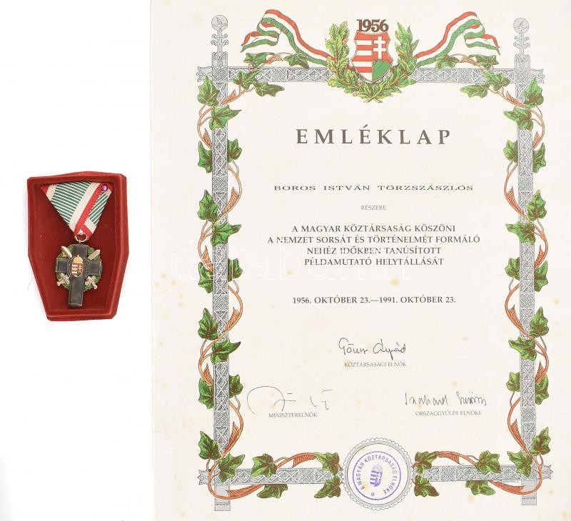 1991-ben átadott 1956-os emléklap Boros István törzszászlós részére, Göncz Árpád köztársasági elnök, Antall József miniszterelnök, valamint Szabad György, az Országgyűlés elnöke nyomdai aláírásával, kis foltokkal, hozzá emlékérem