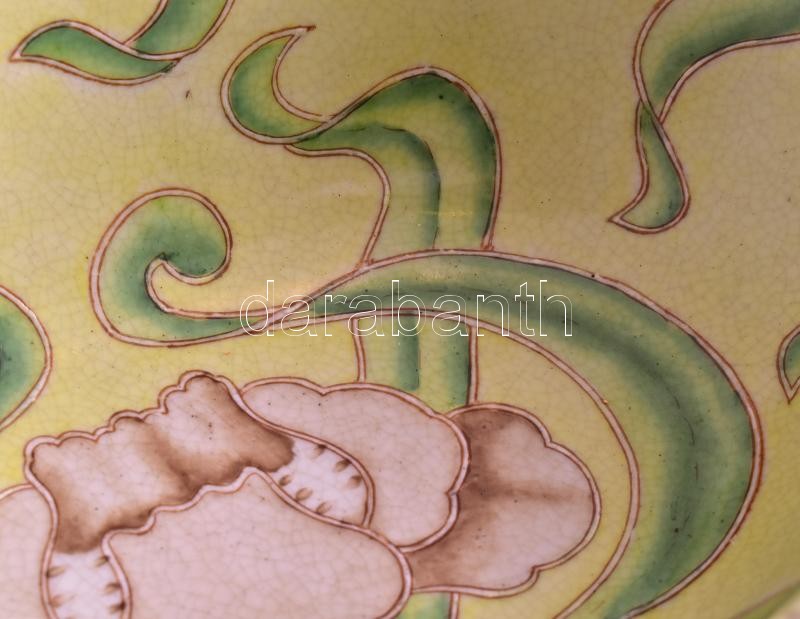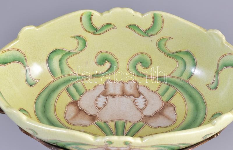 Leírás: Szecessziós stílusú asztali kínáló, fajansz és réz elemekből, kis kopásnyomokkal, 32×26 cm