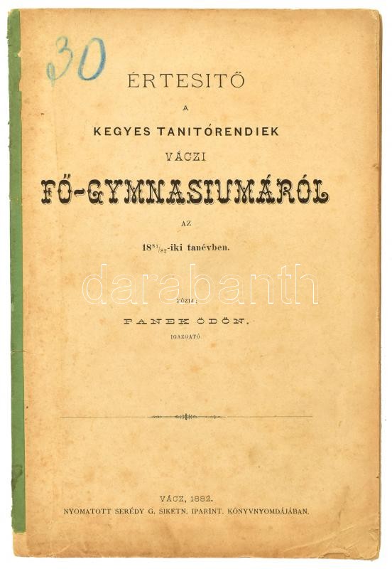 1882 Panek Ödön: Értesítő a kegyes tanítórendiek váczi főgymnásiumáról... https://www.darabanth.com/hu/396-Gyorsarveres/396.0/Mutargy-papirregiseg-egyeb/Nyomtatvanyok~500033/1882-Panek-Odon-Ertesito-a-kegyes-tanitorendiek-vaczi-fogymnasiumarol-az-188182-iki-t~II2411974