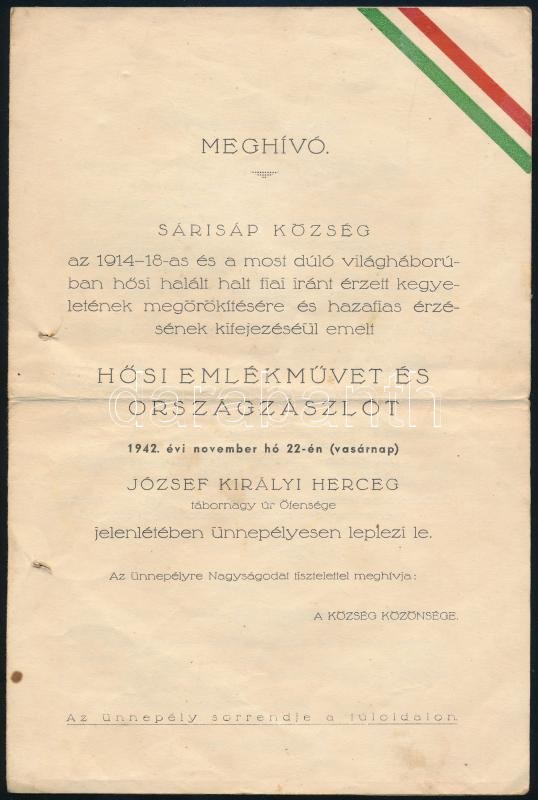 Leírás: 1942 Meghívó a sárisápi hősi emlékmű és országzászló ünnepélyes leleplezésére
