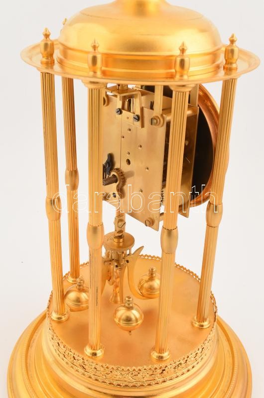 Leírás: 1931 Nagyméretű, aranyozott fém örökjáratos, torziós ingás asztali óra, porcelán számlappal, üvegbúrával, kulccsal, jelzett szerkezettel, talpán "Halasi Pénzintézetek díja 1931. szept. 6." felirattal, kisebb kopásnyomokkal, egyébként jó állapotban. m: 42 cm