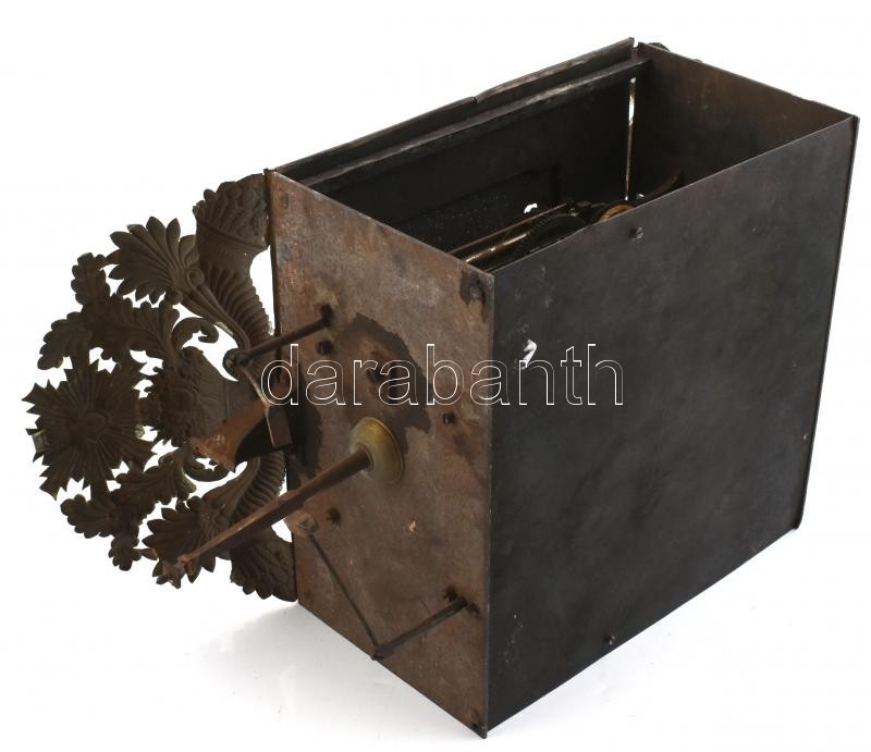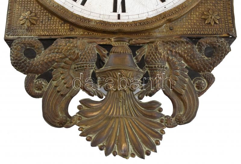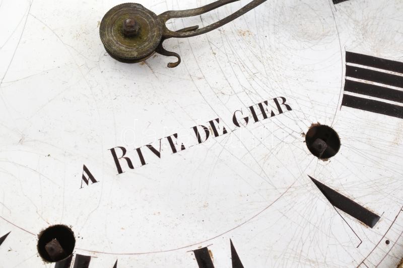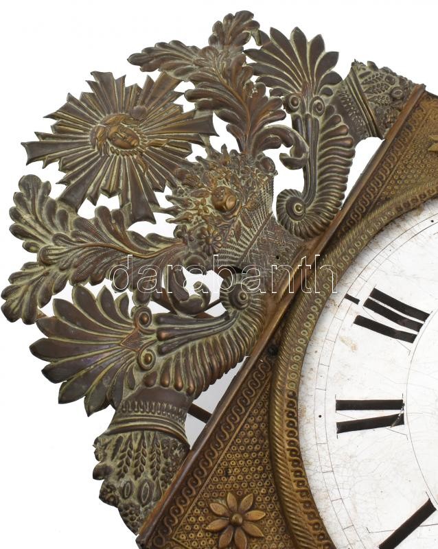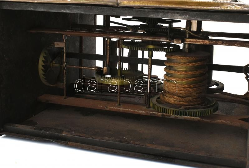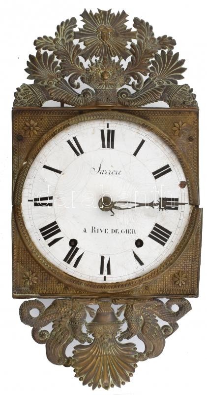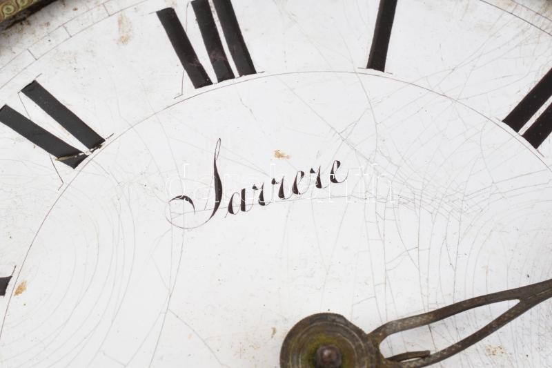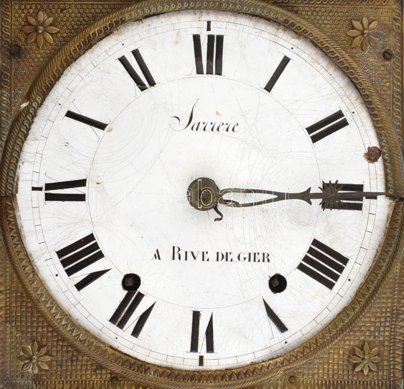 Sarrere - Rive de Gier. Nagy méretű, állóóra szerkezet. XIX: sz. Franciaország. Kissé hiányos, nem működik, zománc számlappal, Préselt réz díszekkel. 24x54 cm