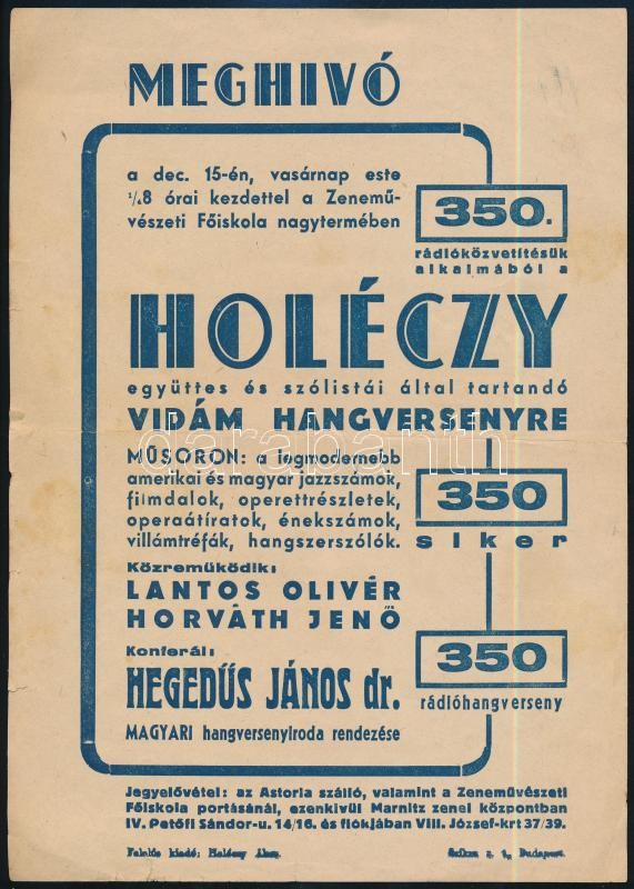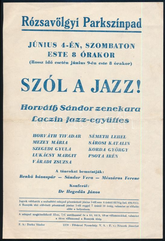 2 db koncertplakát: Rózsavölgyi Parkszínpad, Szól a jazz!, Horváth Sándor zenekara, Laczin jazz-együttes + Holéczy együttes és szólistái hangversenye 350. rádióközvetítésük alkalmából, kis szakadásokkal, 25x17 cm
