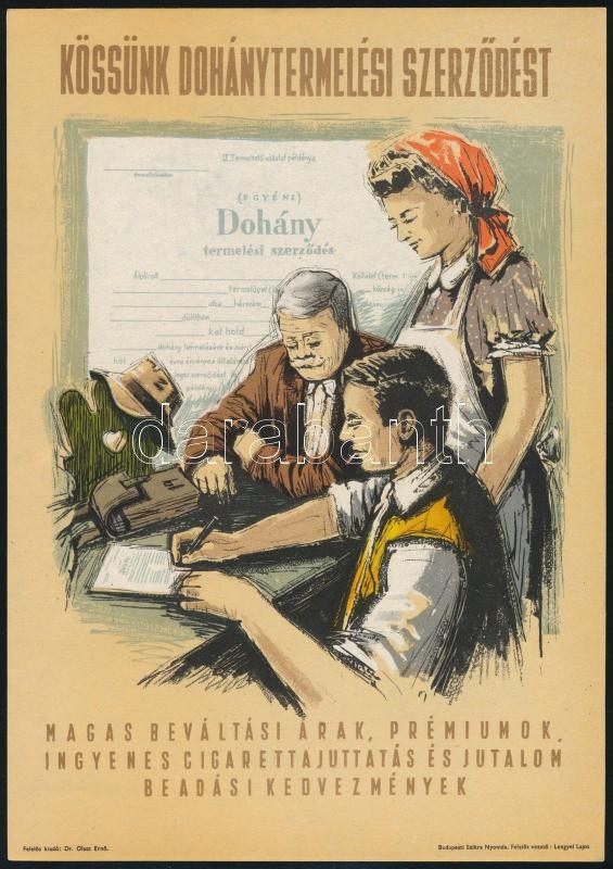 "Kössünk dohánytermelési szerződést" villamosplakát, 23,5×16,5 cm https://www.darabanth.com/hu/396-Gyorsarveres/396.0/Mutargy-papirregiseg-egyeb/Plakat~2000022/Kossunk-dohanytermelesi-szerzodest-villamosplakat-23-5C39716-5-cm~II2413351