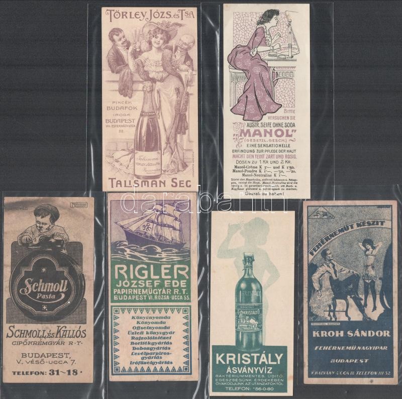 Leírás: 6 db számolócédula (Schmoll, Rigler, Kristály ásványvíz, Kroh Sándor, Törley, Manol)