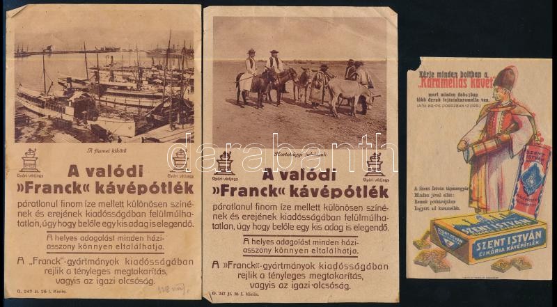 cca 1920-1930 Vegyes Franck kávépótlék tétel, 5 db, 3 számolócédula, 2 reklám nyomtatvány, változó állapotban, közte kissé gyűrött, kissé szakadt, 16x10 cm és 14x7 cm közötti méretben + cca 1928 Szent István cikória kávé reklám nyomtatvány és számolócédula, az egyik sarkán kis hiánnyal, 13x7 cm és 12x8 cm