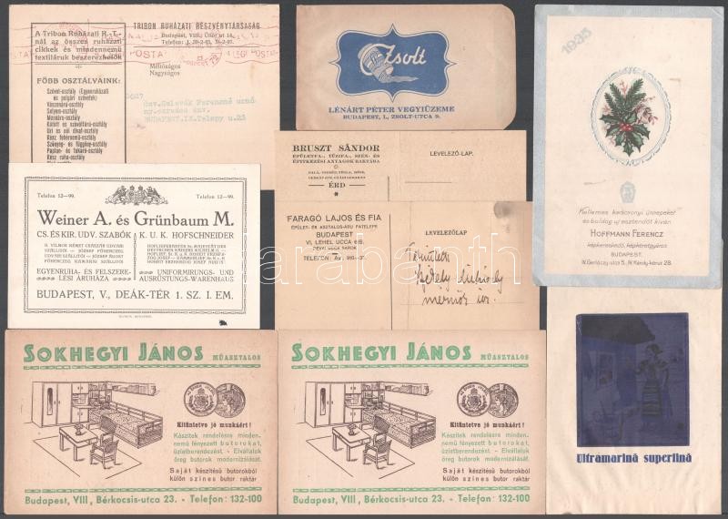 Leírás: cca 1930-1940 Kis vegyes reklám tétel (9 db): reklámborítékok, levelezőlapok, üdvözlőlap, stb.