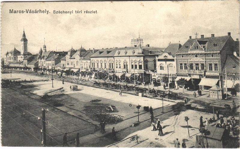 1913 Marosvásárhely, Targu Mures; Széchenyi tér részlet, piac, Fekete Mihály drogériája, illatszertár, Révész Béla könyvnyomda, Tischler József és Kovács József üzlete / square, market, shops