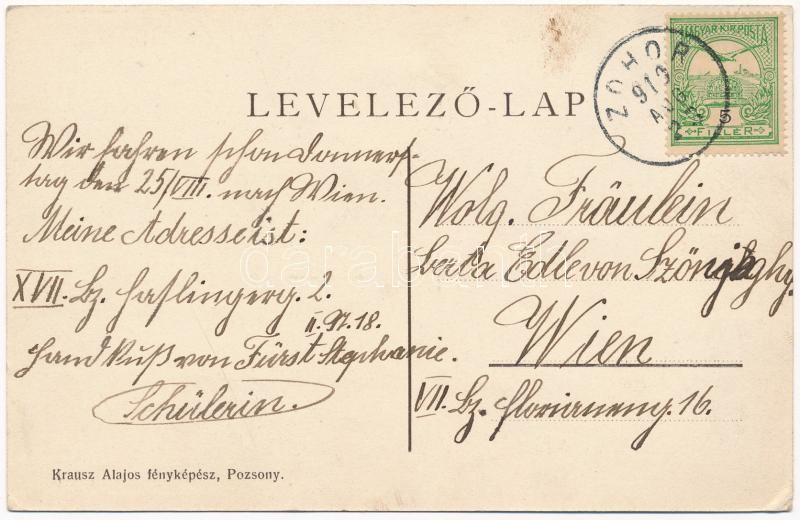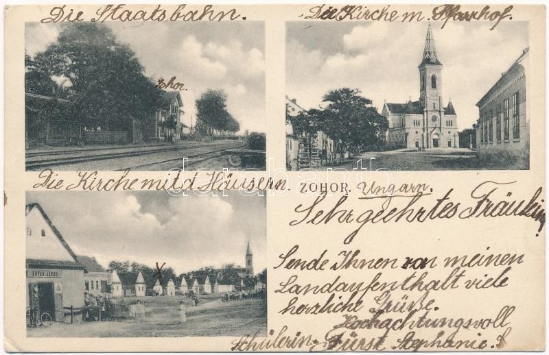 1910 Zohor, Bahnhof, Kirche m. Pfarrhof und Häusern / vasútállomás, templom és paplak, házak, Novák János üzlete. Krausz Alajos fényképész / railway station, church and rectory, houses, shop (EK)