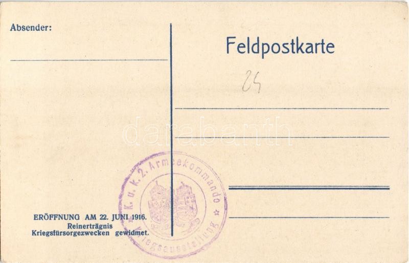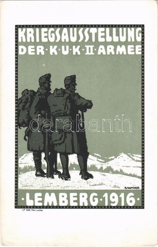 Kriegsausstellung der K.u.K. II. Armee Lemberg 1916 / WWI Austro-Hungarian K.u.K. military art postcard, war exhibition in Lviv (Lwów) s: E. Kutzer + "K.u.K. 2. Armeekommando Kriegsausstellung" So. Stpl. (EK)
