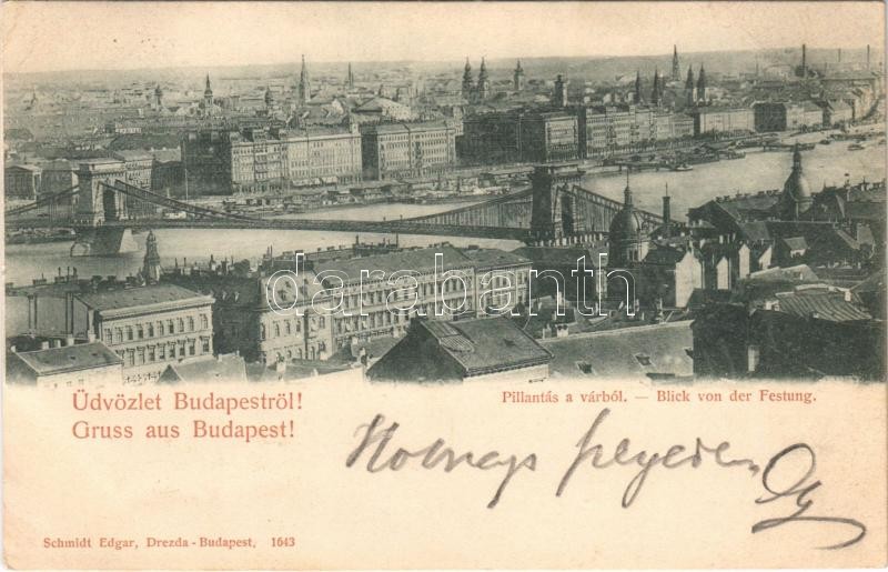 1898 Budapest I. Pillantás a várból, Lánchíd. Schmidt Edgar kiadása (E... https://www.darabanth.com/hu/397-Gyorsarveres/397.0/Kepeslapok/Magyarorszag~1000004/1898-Budapest-I-Pillantas-a-varbol-Lanchid-Schmidt-Edgar-kiadasa-EK~II2420170