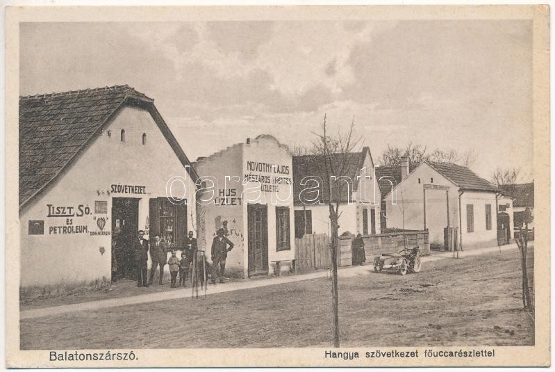 Leírás: Balatonszárszó, Hangya szövetkezet és Novotny Lajos mészáros és hentes üzlete, húsüzlet, liszt, só és petróleum, Fő utca (EK)