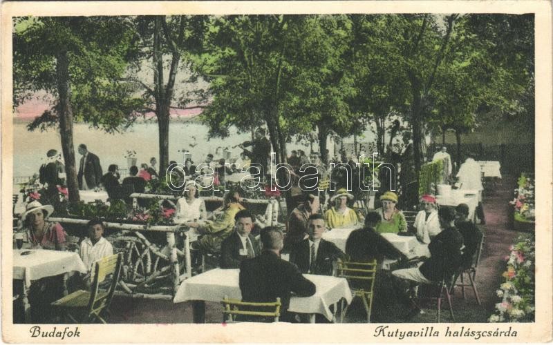 Leírás: Budapest XXII. Budafok, Kutyavilla halászcsárda kerthelyisége, felszállóhely: Gellért szálló, leszállóhely: Budafok őrház